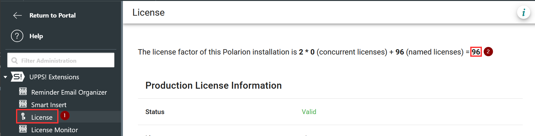 - Determines the validity of your UPPS!E production license. Meaning: If the license factor granted by your UPPS!E production license is greater or equal to the license factor of your Polarion license, the UPPS!E license is valid.