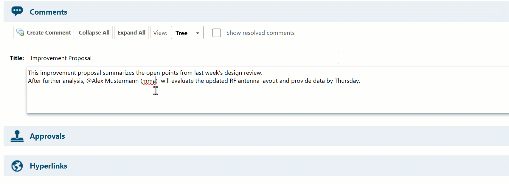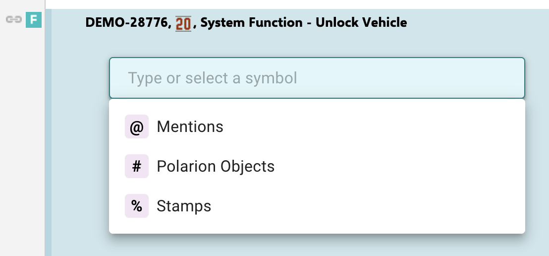The Smart Insert allows you to generate and insert content, such as timestamps, mentions, and cross-referenced Work Items directly while typing in Polarion text fields (e.g. Work Item Description, Text Custom Field, Comment Thread).