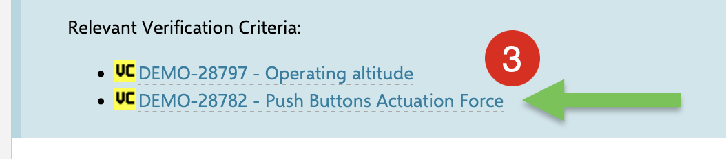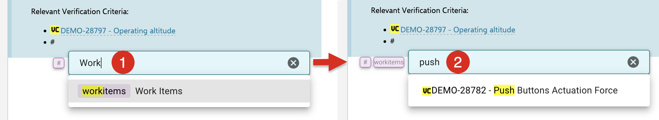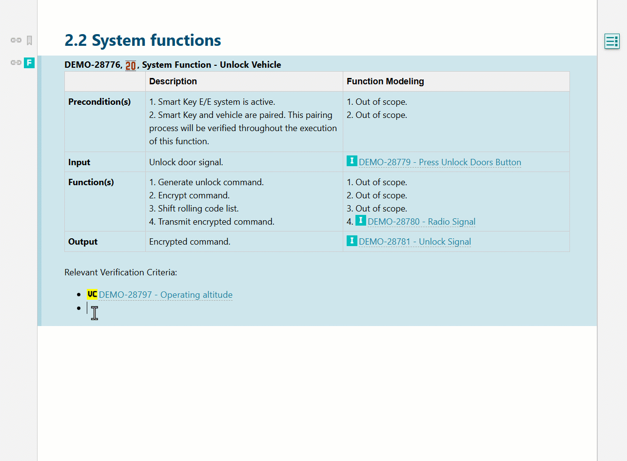 Imagine you are working in a Live Document that represents the architectural design of a mechatronic product under development, namely, a vehicle radio key. In this document, under the heading System Functions, you use the Work Item type F (Function) to describe the system functions of the radio key. Elsewhere in the same Live Document, under the heading Verification Criteria, you use the Work Item type VC (Verification Criterion) to define the verification criteria that must be applied when testing these system functions.