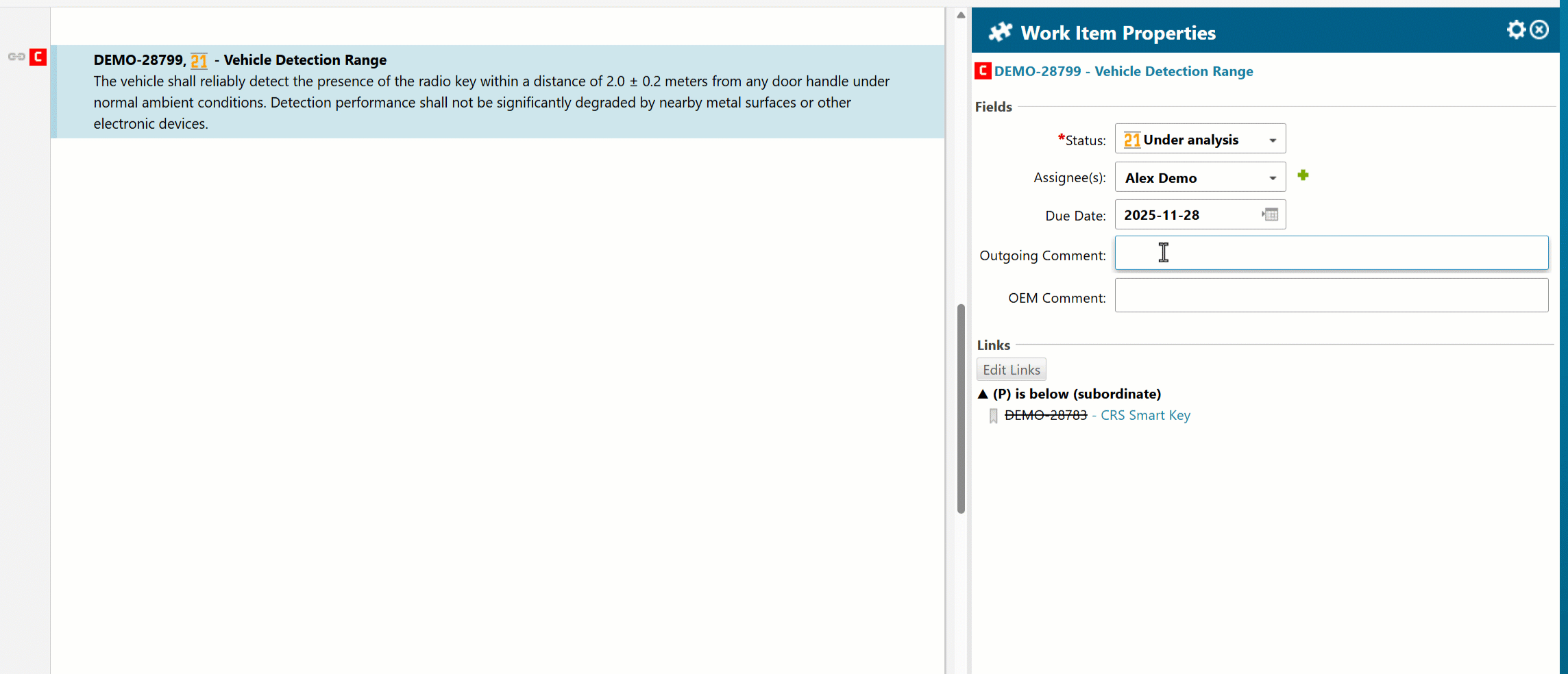 Imagine you are working in a Live Document containing the imported customer requirements specification for a mechatronic product your company is to develop and delive, again, a vehicle radio key. In this document, the customer requirements are represented as Work Items of type C (Customer Requirement). To ensure that any questions that arise can be clarified with the customer via roundtrip, each Work Item includes a custom field called Outgoing Comment. It is required that anyone who encounters ambiguities while assessing a requirement must use this field to raise their questions, first entering the current date and their name in a specific format, followed by their question(s) for the customer.